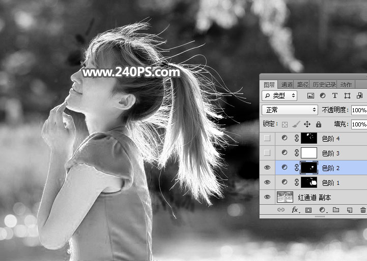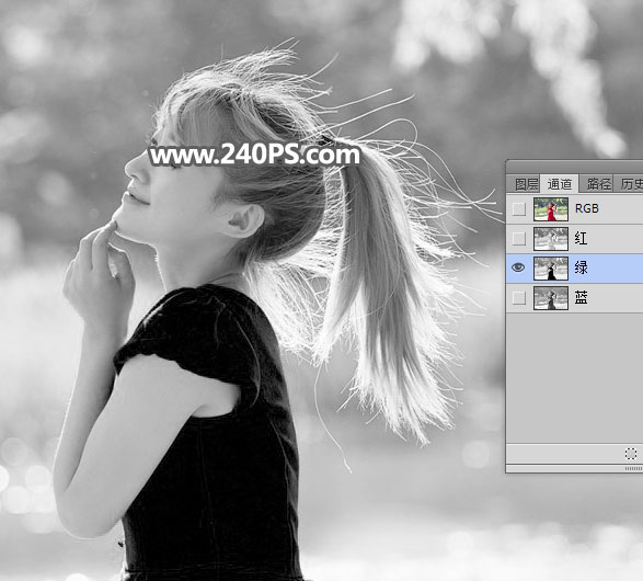 红通道:发丝非常亮,背景都是灰色,比较理想。