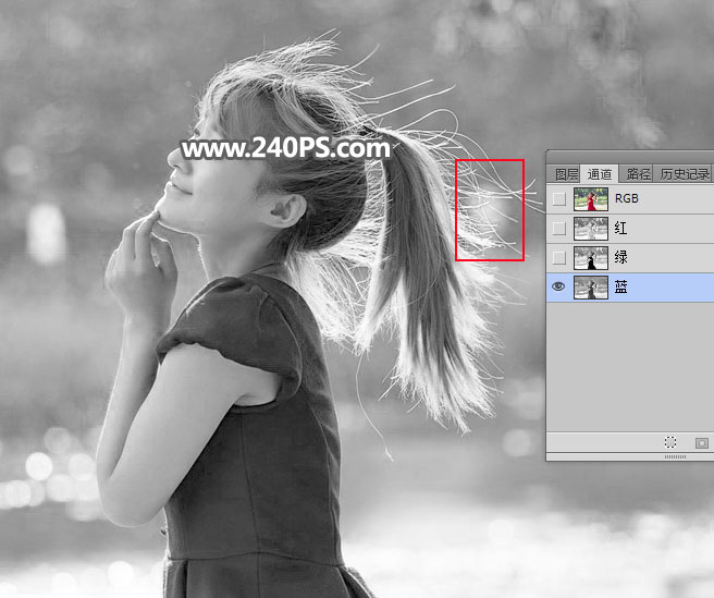 蓝通道:背景与发丝都比较暗,发丝边缘有一些光斑,不是很好。