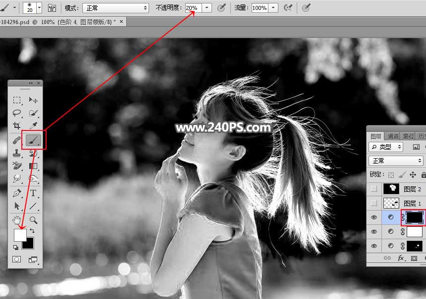 13、选择画笔工具,前景色设置为白色,画笔不透明度设置为20%,如下图。
