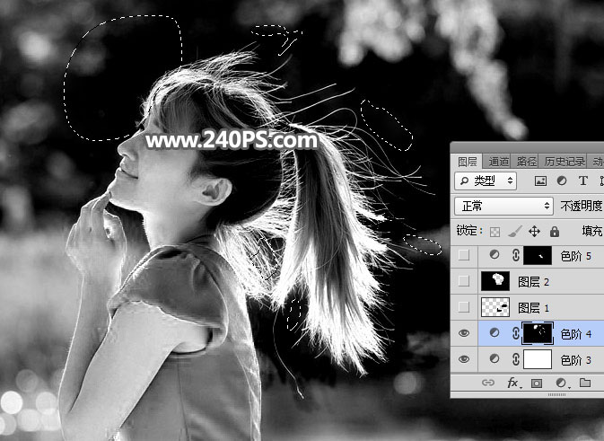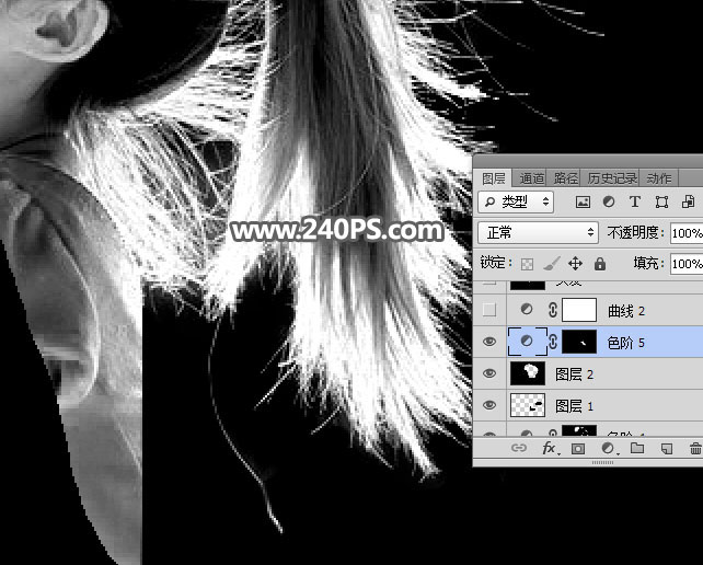 20、底部局部发丝有点偏亮,用套索工具选取,羽化8个像素后创建色阶调整图层,增加明暗对比,参数及效果如下图。