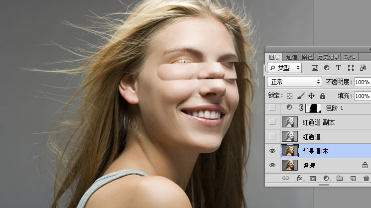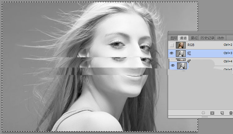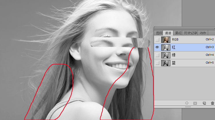 2、进入通道面板,来分析一下各通道。红通道高光部分的发丝非常清晰,不过左下角和右下角部分的发丝都是较暗的,并与高光发丝融合起来,用通道很难全部抠出。