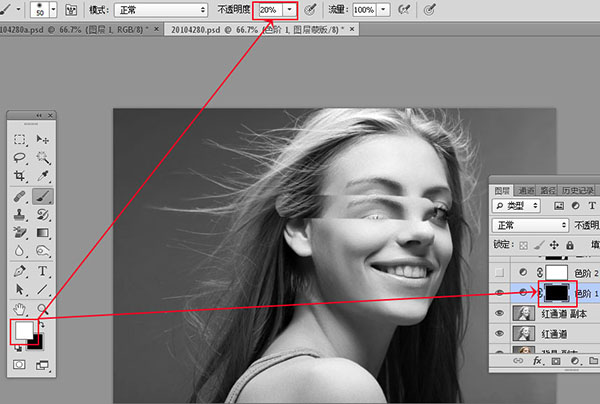 9、把前景色设置为白色,选择画笔工具,画笔不透明度设置为20%,如下图。