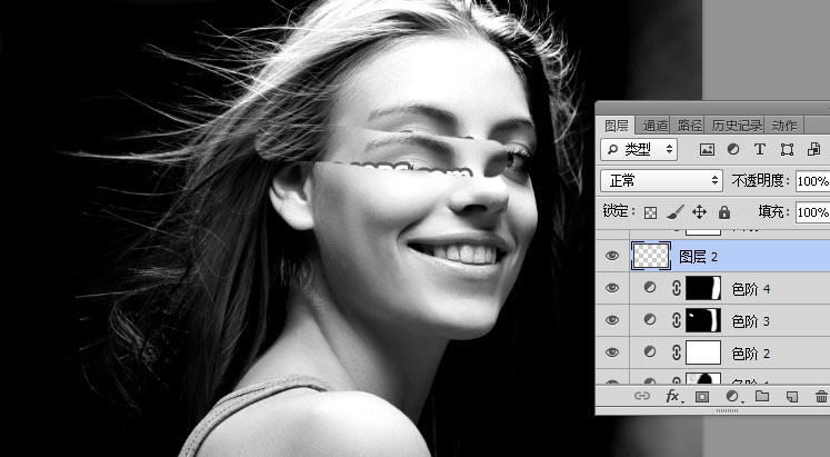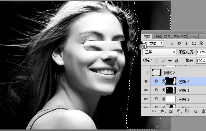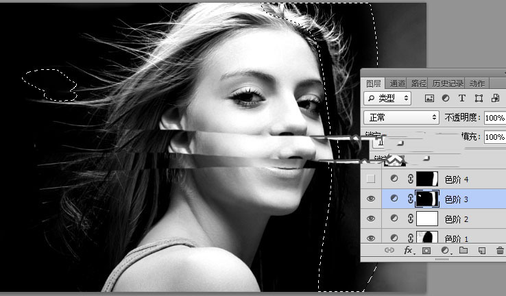 13、创建色阶调整图层,参数设置如下图,确定后把蒙版填充黑色,然后用透明度为10%的柔边白色画笔把右侧发丝有杂色的区域涂暗。