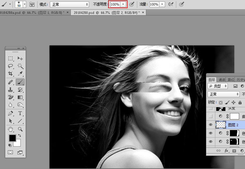 15、把前景色设置为黑色,选择画笔工具,画笔不透明度设置为100%,如下图。