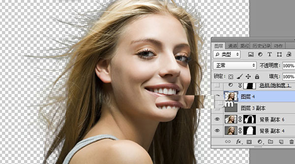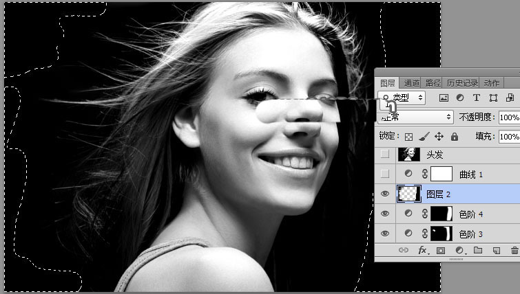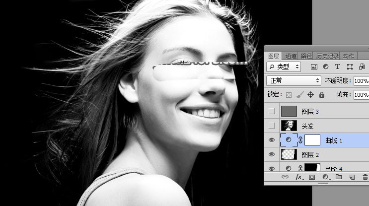 30、用透明度为10%的柔边白色画笔把局部缺失的发丝部分擦出来。