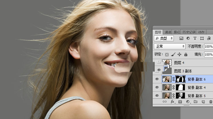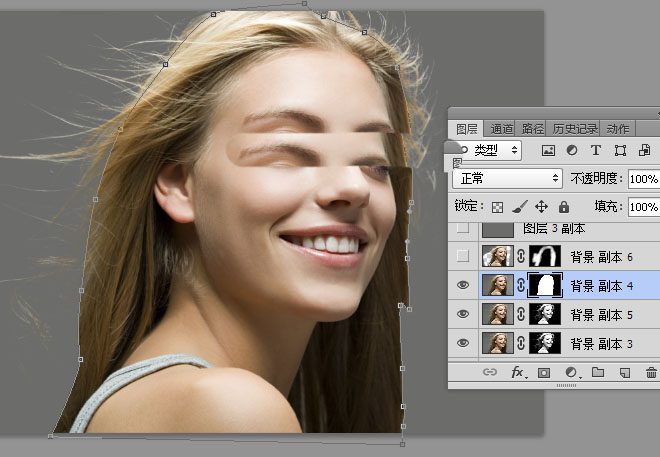 24、把背景图层复制一层,按Ctrl + Shift + ] 置顶,用钢笔工具勾出人物主体部分路径,按Ctrl + 回车把路径转为选区,然后添加图层蒙版,过程如下图。