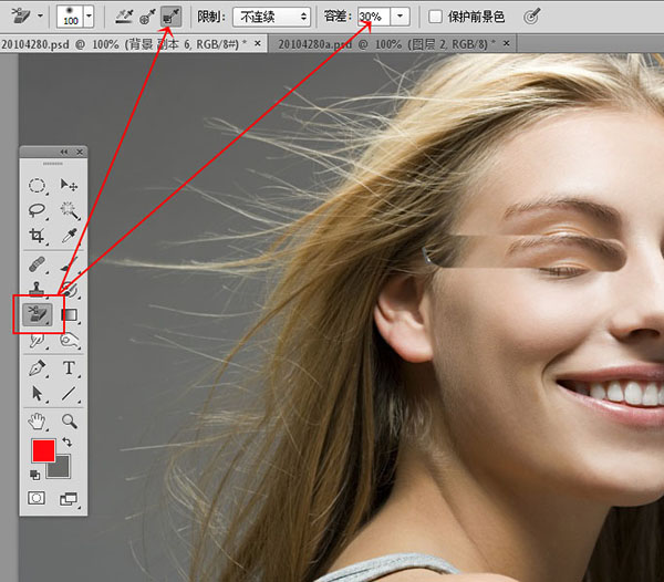 26、在工具箱选择“背景橡皮擦工具”,属性设置如下图,容差设置为30%,然后在左侧发丝部分涂抹消除背景。