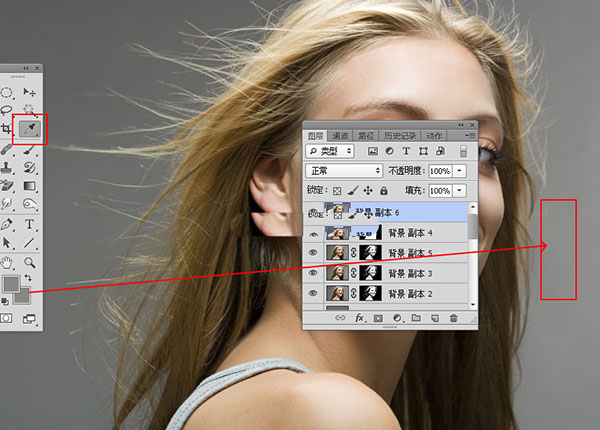25、把背景图层复制一层,按Ctrl + Shift + ] 置顶;然后点击背景色调出拾色器,在下图红圈位置点一下吸取背景色。