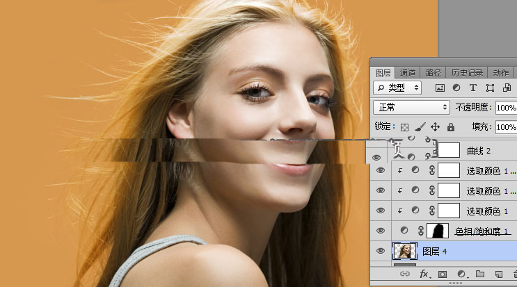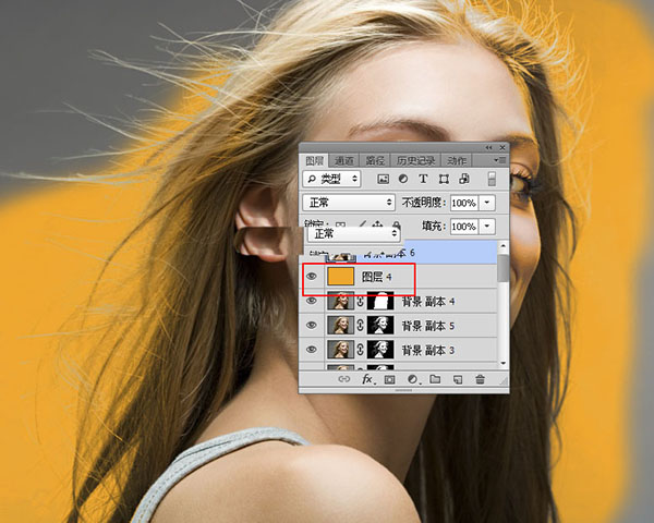 28、把右侧的发丝背景擦掉,为了观察,可以在当前图层下面新建一个图层,填充橙黄色,发丝部分涂干净后把橙色图层删除。
