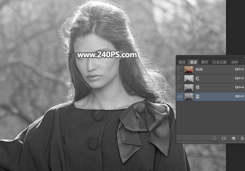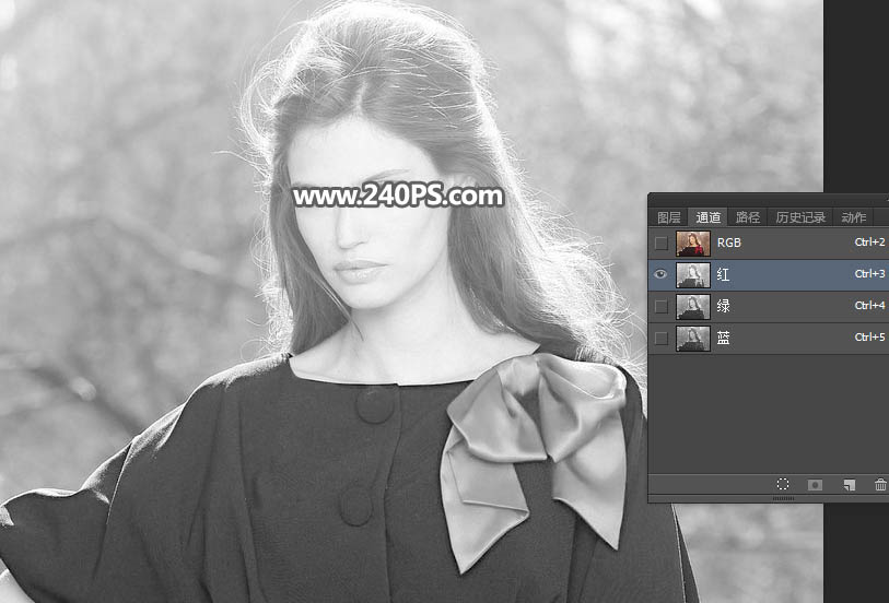 2、观察通道。进入通道面板,观察一下各通道,红通道有点漂亮,发丝与背景颜色接近。