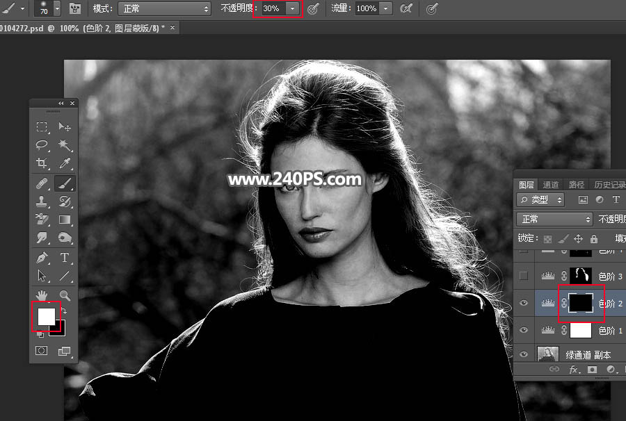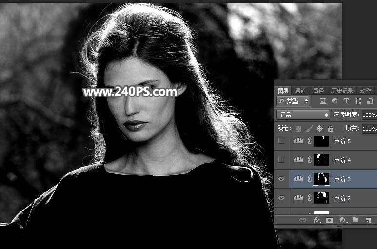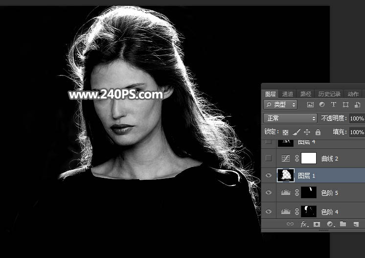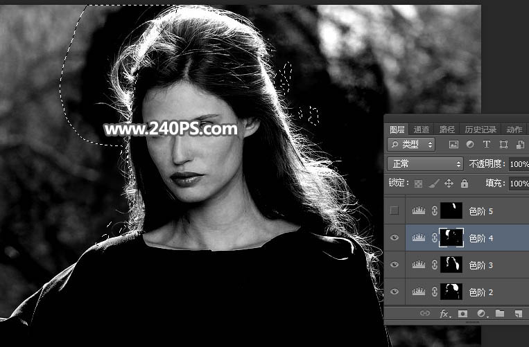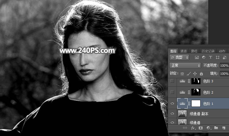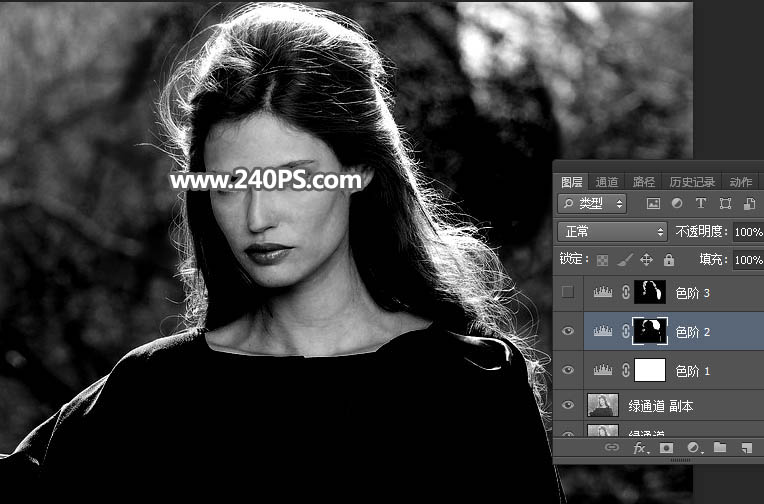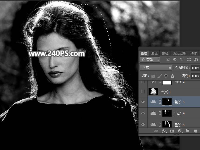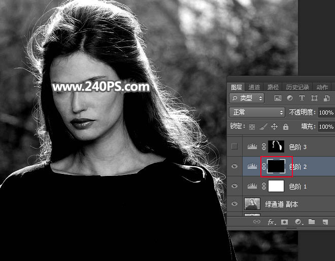 18、创建色阶调整图层,重复上一步操作,再用柔边白色画笔把局部发丝涂抹干净。
