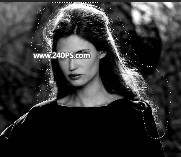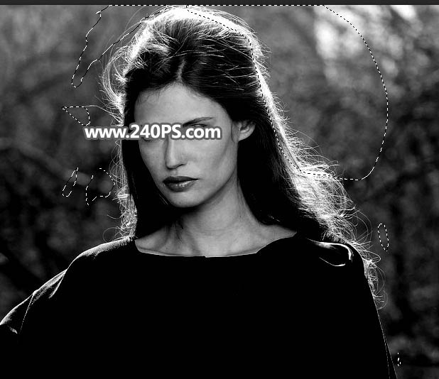 15、用刚才的柔边白色画笔把下图选区部分的发丝涂抹明显一点。