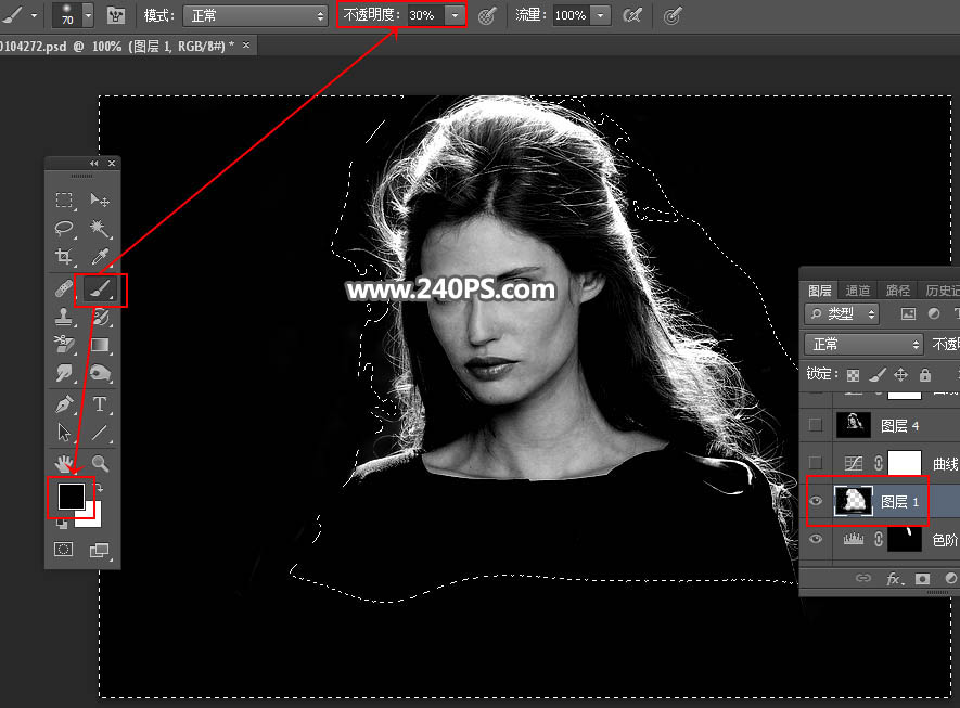 11、把前景色设置为白色,选择画笔工具,画笔不透明度设置为30%,如下图。