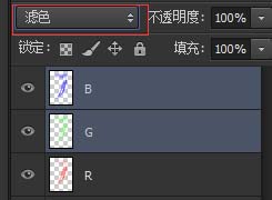 6、R、G、B这三个图层都填充好后(顺序可以随意),总之将最上面的两个图层的叠加模式改为滤色,最下面的叠加模式为正常
