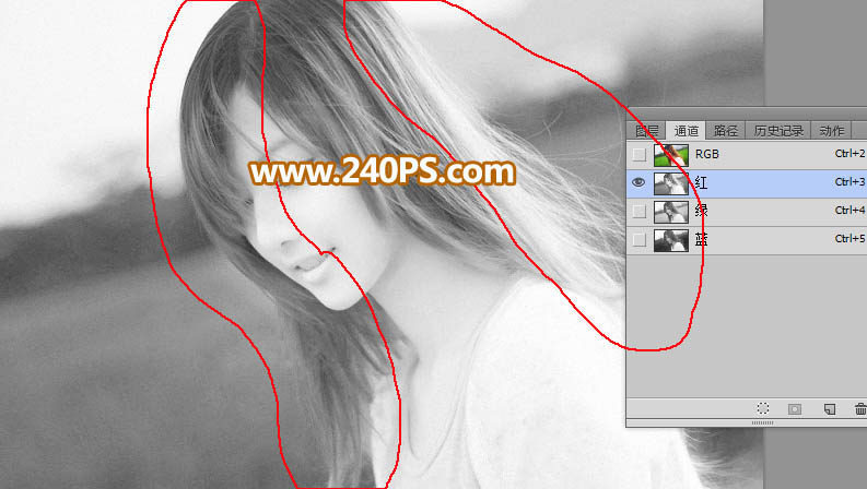 1、打开素材图片大图,进入通道面板,观察一下各通道,左侧发丝以深灰色为主,右侧发丝以灰白色为主。