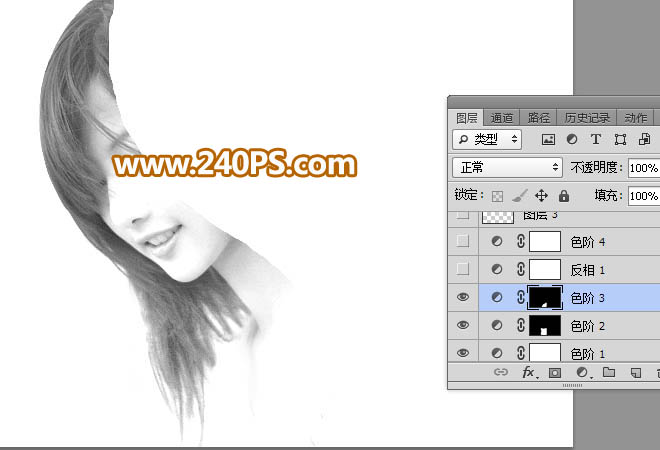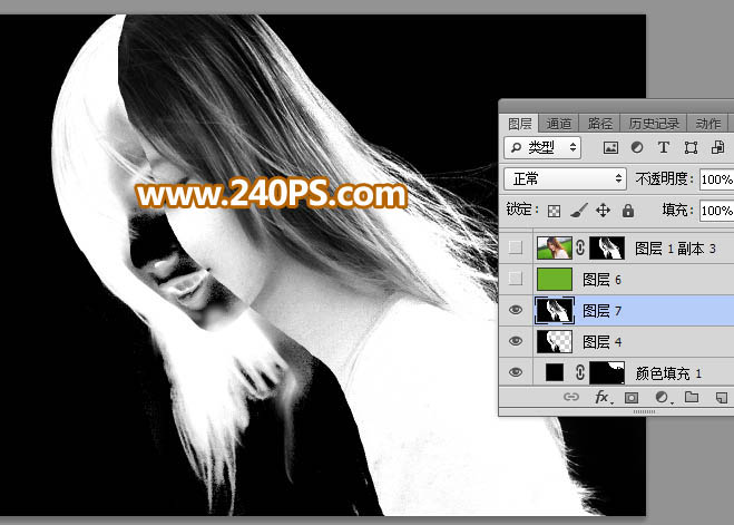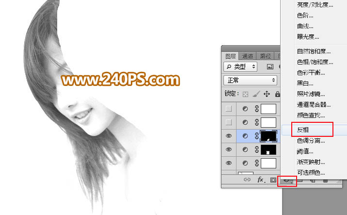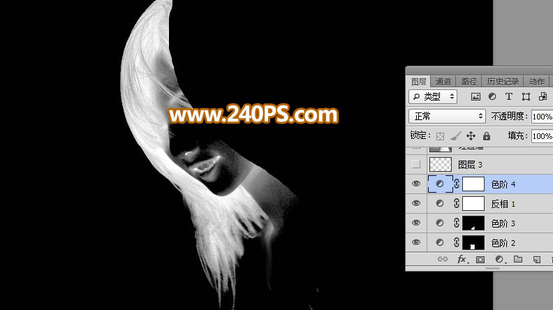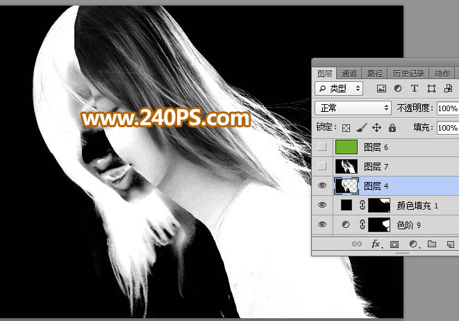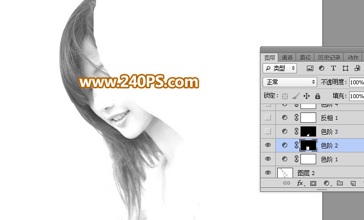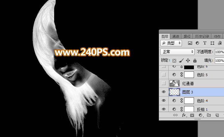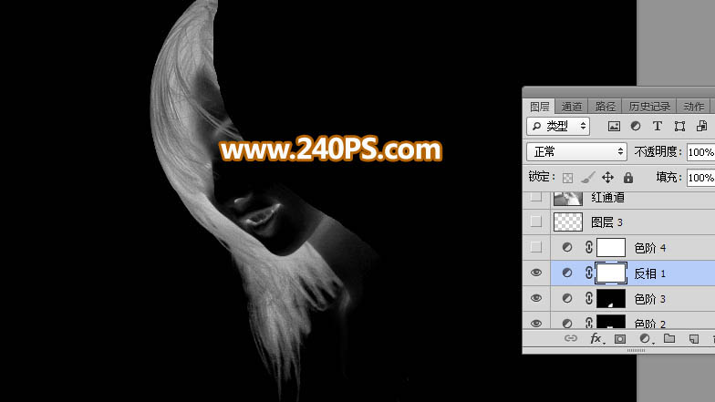 9、创建反相调整图层,把发丝转为白色,同时把背景转为黑色,效果如下图。