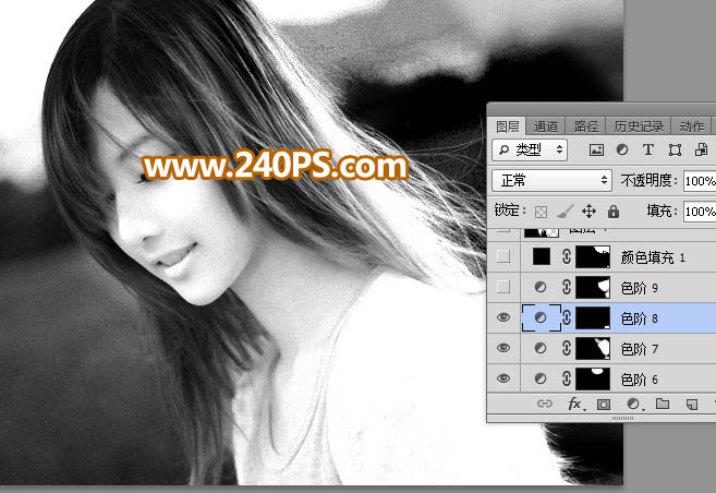 20、其它区域发丝与背景不是很明显的,可以再用同样的方法增加对比,过程如下图。