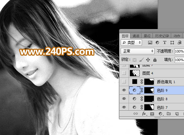 10、创建色阶调整图层,把发丝稍微调亮一点,参数及效果如下图。
