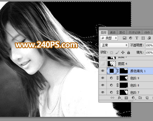21、创建纯色填充图层,颜色设置为黑色,确定后把蒙版填充黑色,再用钢笔及画笔把发丝背景区域变成黑色,如下图。