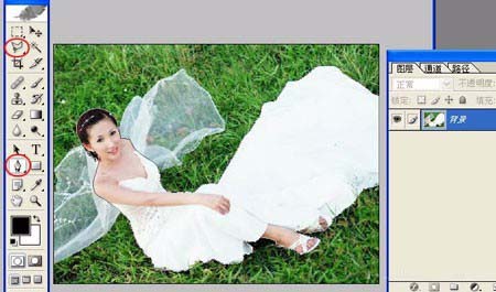 7、我们现在想怎样的一个办法将婚纱里的草去掉呢?用高斯模糊可以做到,具体做法请继续往下看。