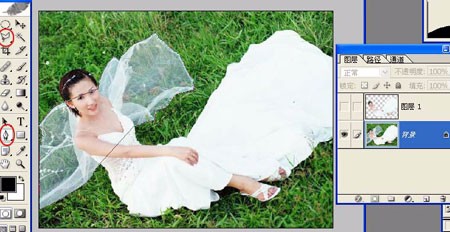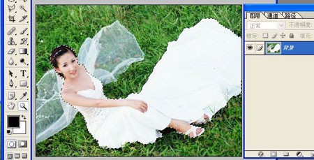 4、隐藏图层1,回到背景图层,用钢笔工具或套索工具勾出透明的婚纱,我们着重要处理的也是这透明部分了。