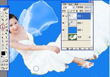 16、按ctrl+d取消蚂蚁线,让图层1前的眼睛出现,这个婚纱抠图基本完成了。