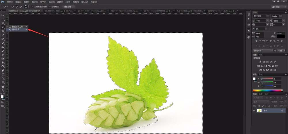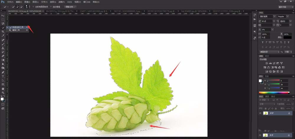 7、但是我们在photoshop抠图中,会经常遇到特殊的图片,“魔棒工具”无法智能全部选择,此时我们需要进行额外的修改,选择“快速选择工具”,进行一定的微调。