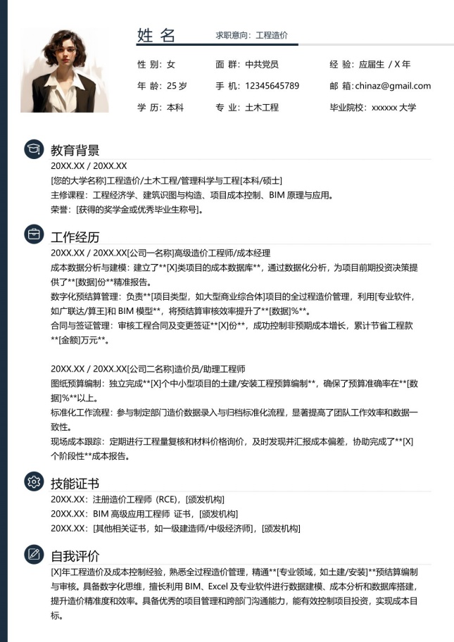 工程造价数据化简历模板,适用于工程造价简历、通用简历、求职简历、个人简历、商务简历、找工作简历、竞聘简历等相关的个人简历主题设计应用。