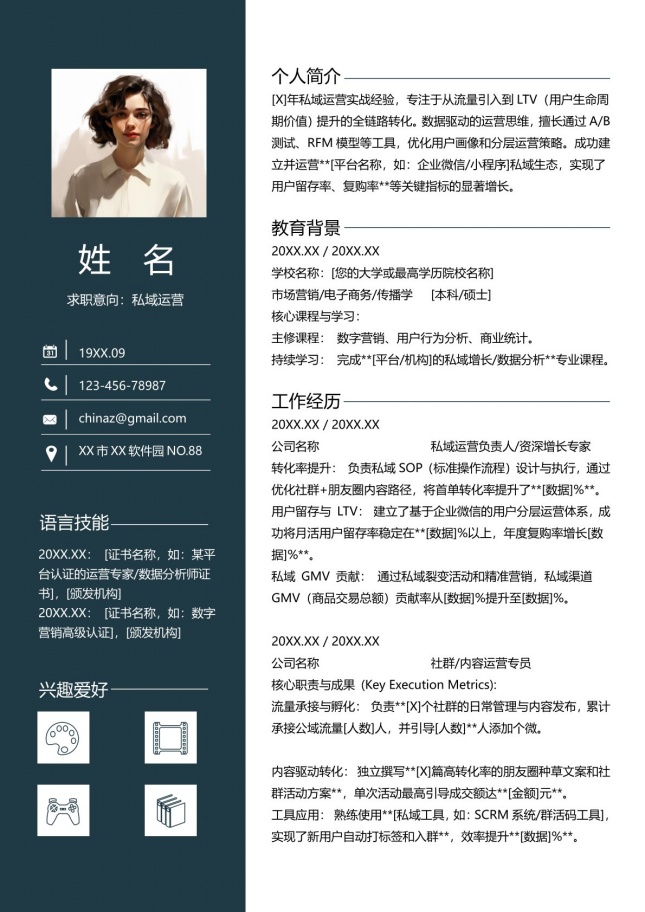 私域运营转化型个人简历模板,适用于私域运营、通用简历、求职简历、个人简历、商务简历、找工作简历、竞聘简历等相关的个人简历主题设计应用。