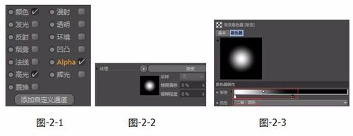 2、圆盘材质调节:双击创建一个材质,设置颜色, 在基本选项勾选Alpha,到Alpha选项,纹理选项赋予一个渐变,再复制一层只保留颜色赋予外面的大球体。