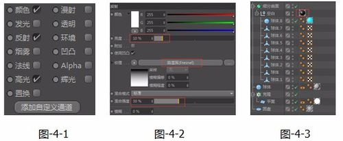 4、外金属框材质:双击创建一个材质,设置颜色:黑色,勾选发射,亮度10%,纹理:菲涅尔, 混合强度:30%,赋予打组的球体。