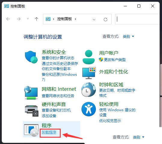 3、控制面板窗口,【类别】查看方式,点击调整计算机的设置下的【卸载程序】;