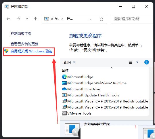4、程序和功能窗口,左侧边栏,点击【启用或关闭 Windows 功能】;