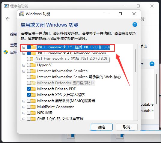 5、Windows 功能窗口,找到并勾选【.NET Framework 3.5 (包括 .NET 2.0 和3.0)】;