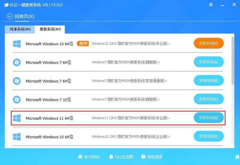 3、比如说我们要安装原版的Win11系统,可以切换到【原版系统】选项卡,然后找到【Microsoft Windows 11 64位 (Windows11 22H2 微软官方MSDN原版系统(专业版))】,然后点击【安装系统】;
