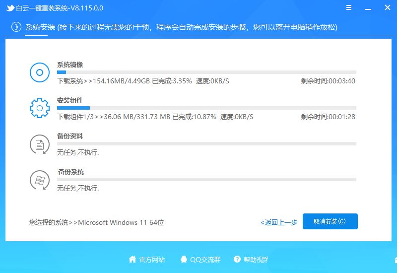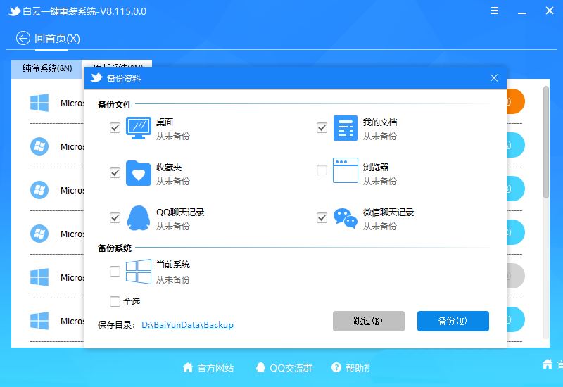 4、点击安装原版的Win11系统后,会提示是否备份资料,备份文件支持【桌面/我的文档/收藏夹/浏览器/QQ聊天记录/微信聊天记录】,以及备份【当前系统】,如果不需要备份,直接点击【跳过】即可;