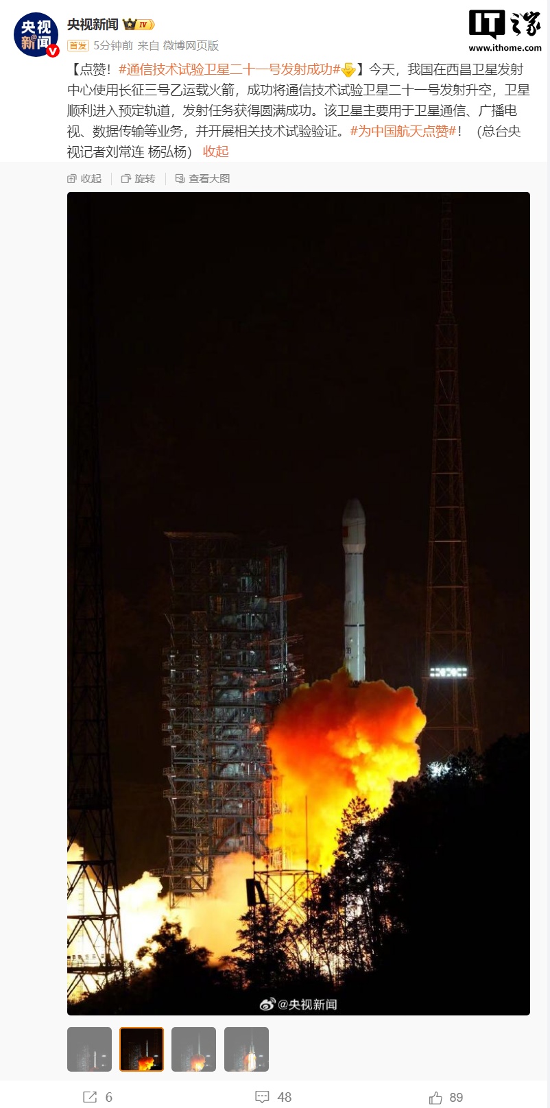 11 月 21 日消息,据央视新闻报道,11 月 21 日 18 时 55 分,我国在西昌卫星发射中心使用长征三号乙运载火箭,成功将通信技术试验卫星二十一号发射升空,卫星顺利进入预定轨道,发射任务获得圆满成功。