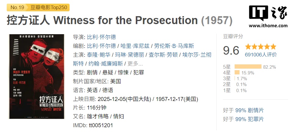 11 月 21 日消息,电影《控方证人》于今日官宣定档 12 月 5 日在内地上映,该电影于 1957 年首次在美国上映,当前豆瓣评分高达 9.6,位列豆瓣电影 Top250 排行榜第 19 名。