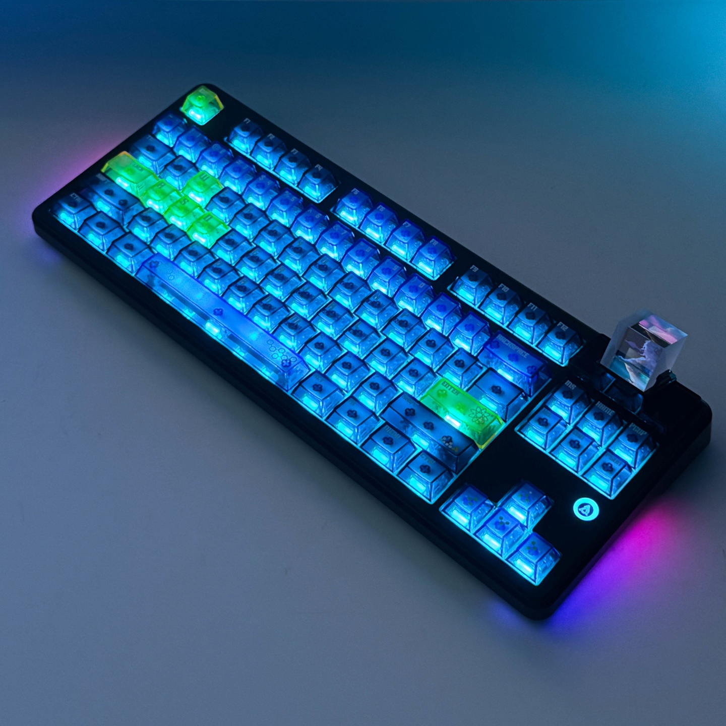 黑爵 MK87 棱镜版键盘采用 87 键 80% 配列和 Gasket 垫片固定结构;基于 1.2mm 单键开槽 PCB,支持轴体热插拔,具备 1600 万色下灯位 RGB 背光(注:空格键拥有 9 颗灯珠);拥有 4 层填充和横向开槽 PC 定位板。