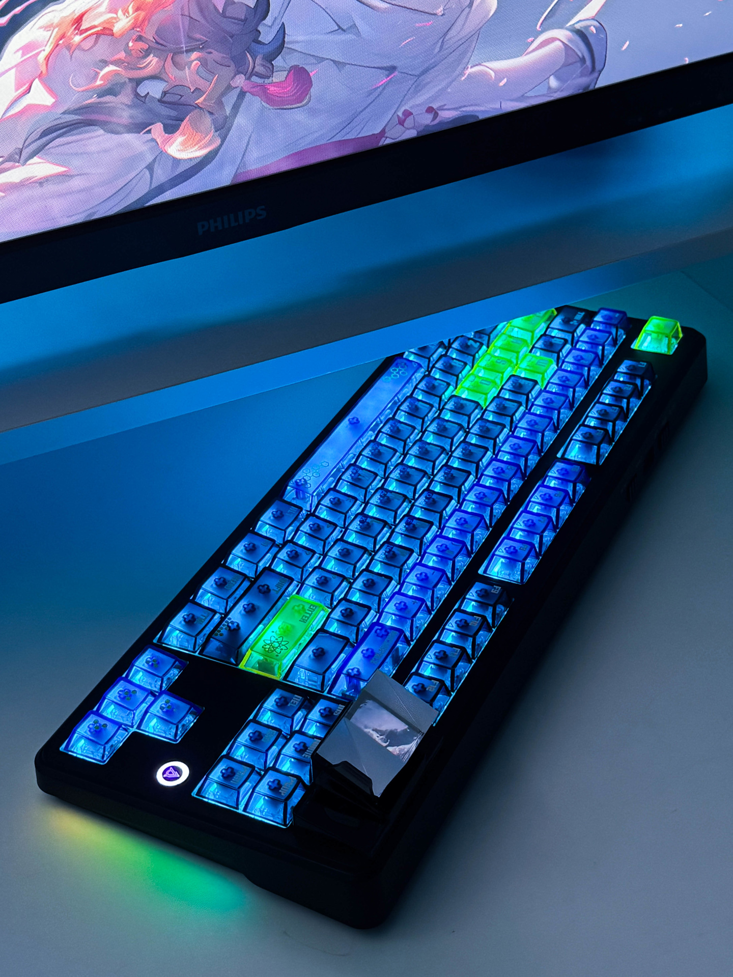 其搭载荔枝轴 V2 线性轴体,触发行程 2.0±0.4mm、总行程 3.6±0.2mm,触发压力 42±8gf、触底压力 52±8gf。配套键帽为彩透元素周期表配色,与棱镜屏幕一道形成幻境光学效果。