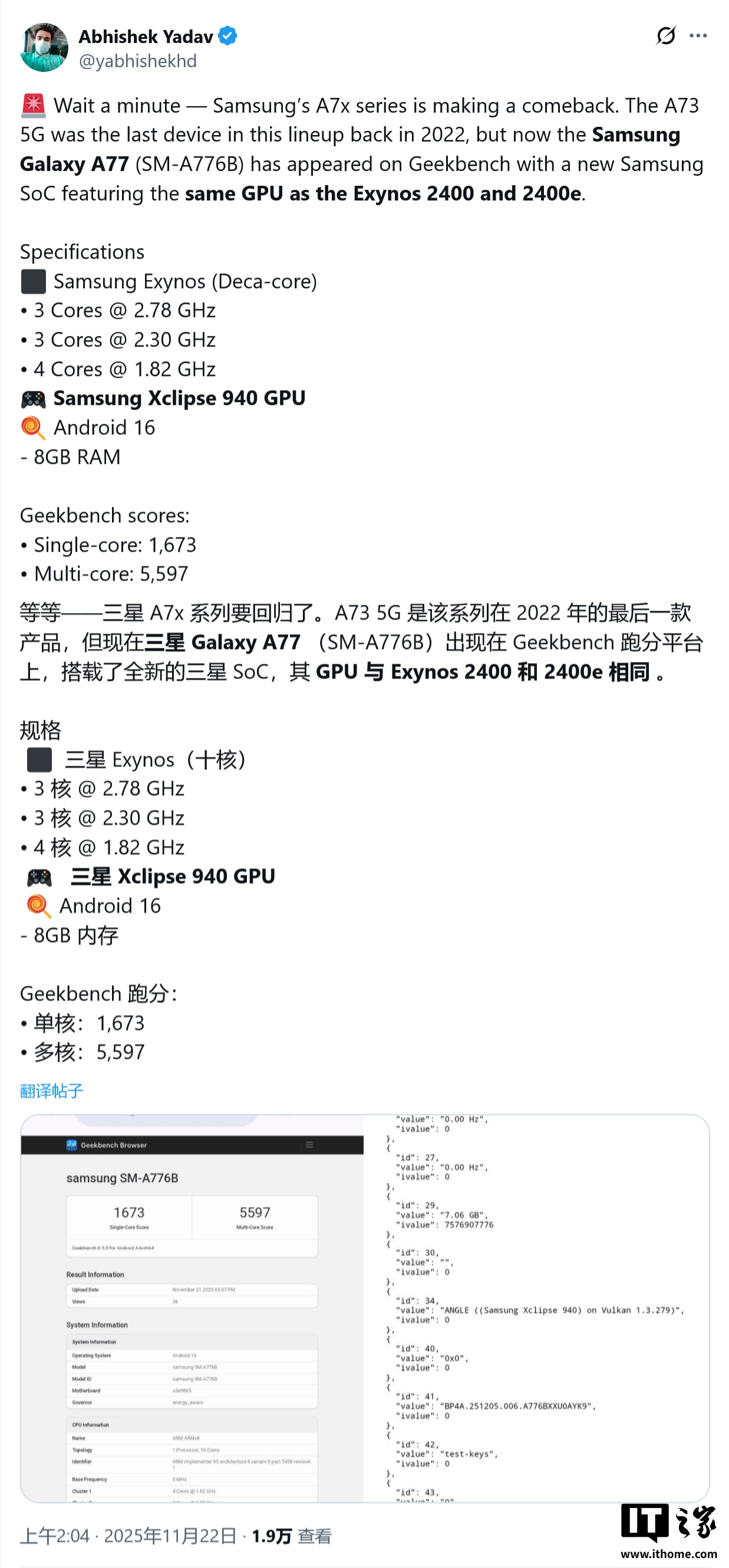 11 月 22 日消息,消息源 @yabhishekhd 今天(11 月 22 日)发布博文,报道称三星有望重启 Galaxy A7x 系列,新机 Galaxy A77 在 Geekbench 跑分平台现身。
