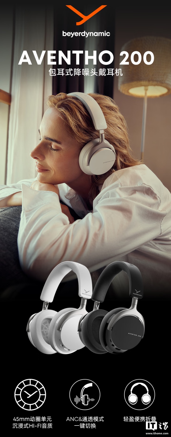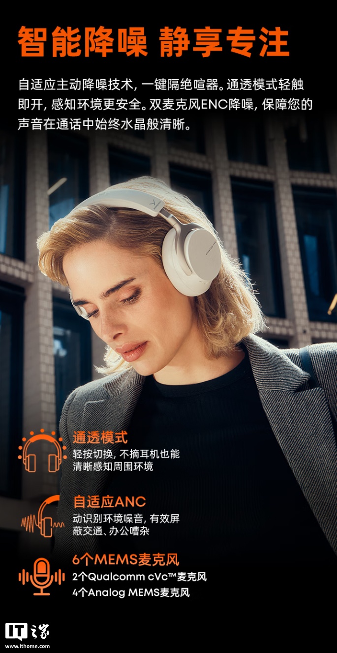 据介绍,这款耳机搭载 45mm 拜雅驱动单元,可呈现 10Hz-22000Hz 宽广声场与精准解析力,配备自适应主动降噪技术,支持通透模式,可通过轻触机身打开,内置双麦克风 ENC 降噪,可让通话过程中减少杂音。