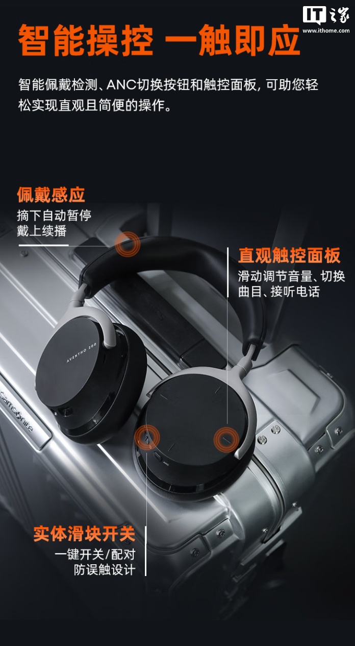 功能方面,这款耳机搭载智能佩戴检测、ANC 切换按钮和触控面板,支持佩戴感应,摘下耳机就能自动暂停音乐,右侧的触控面板可直观调整音量、切换曲目、接听电话等,支持连接双设备,可将耳机与手机、笔记本协同使用。