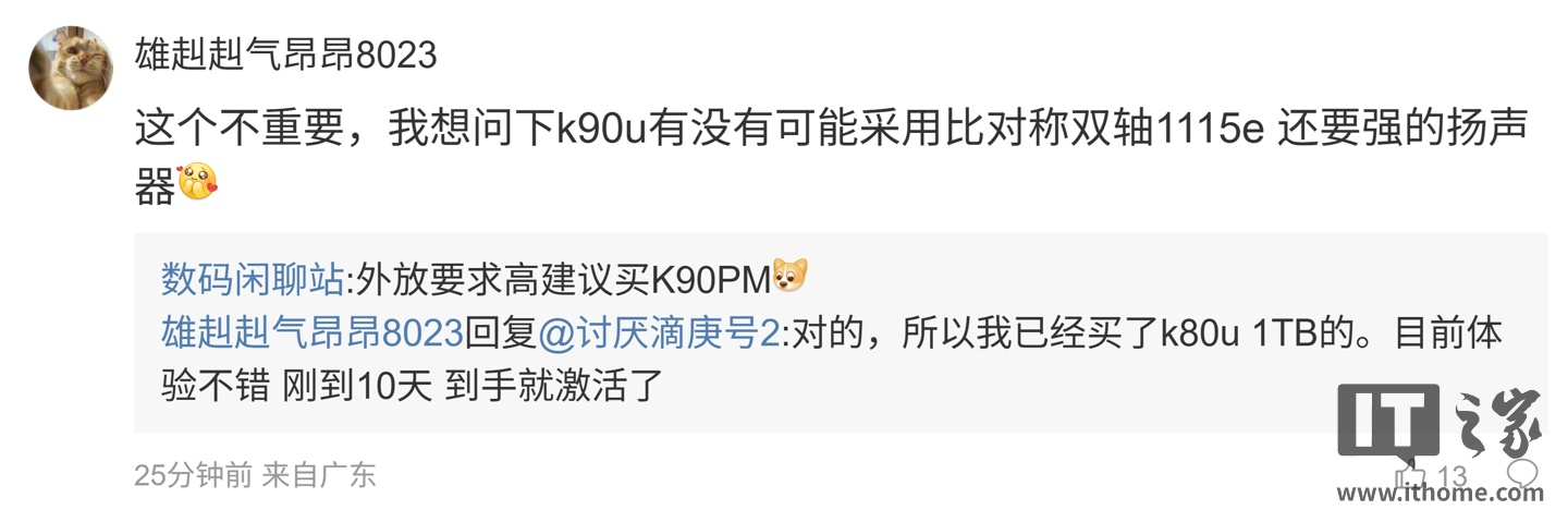 后续有用户在评论区询问:“这个不重要,我想问下 k90u 有没有可能采用比对称双轴 1115e 还要强的扬声器”,博主回复道:“外放要求高建议买 K90PM”。