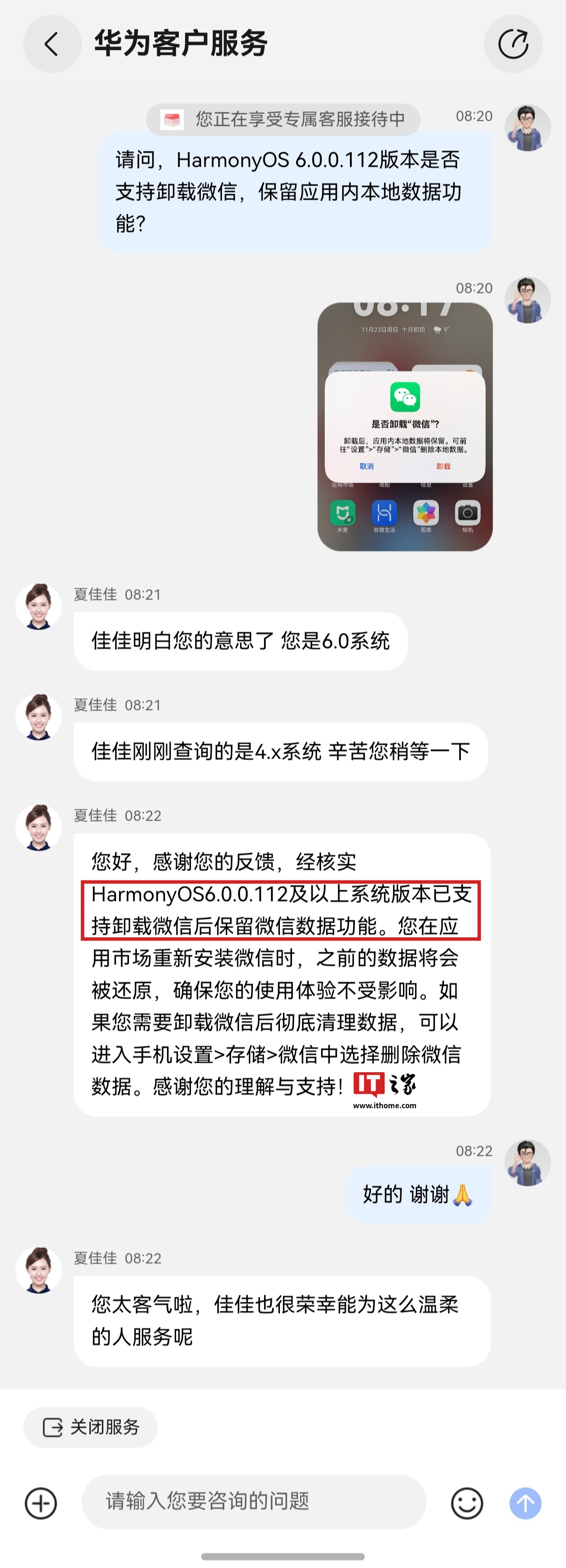 经核实 HarmonyOS 6.0.0.112 及以上系统版本已支持卸载微信后保留微信数据功能。您在应用市场重新安装微信时,之前的数据将会被还原,确保您的使用体验不受影响。如果您需要卸载微信后彻底清理数据,可以进入手机设置 > 存储 > 微信中选择删除微信数据。感谢您的理解与支持!