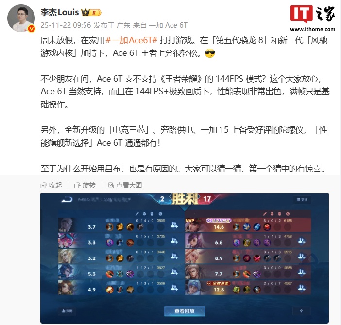 注意到,一加中国区总裁李杰昨日发文透露,一加 Ace 6T 手机搭载第五代骁龙 8 处理器、内置新一代「风驰游戏内核」,并确认支持《王者荣耀》144FPS 模式。他表示,新机在 144FPS + 极致画质下,性能表现非常出色,满帧只是基础操作。