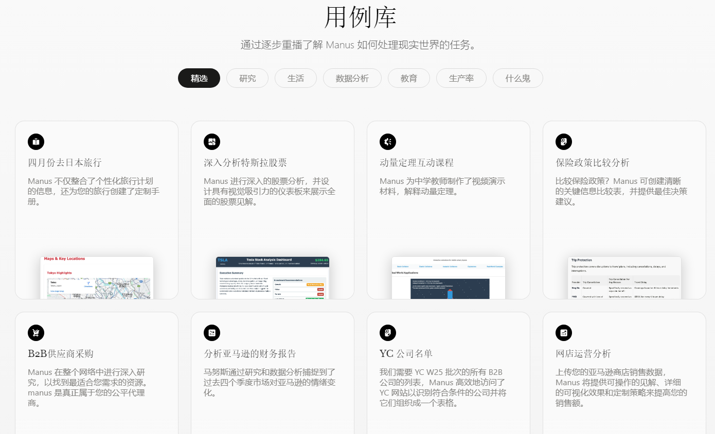 Manus 是全球第一款通用 Agent 产品,可以解决各类复杂多变的任务。无论你需要深入的市场调研、繁琐的文件批量处理、个性化的旅行规划还是专业的数据分析,Manus 都能通过独立思考和系统规划,在自己的虚拟环境中灵活调用各类工具——编写并执行代码、智能浏览网页、操作各类网页应用——为你直接交付完整的任务成果,而非仅仅提供建议或答案。