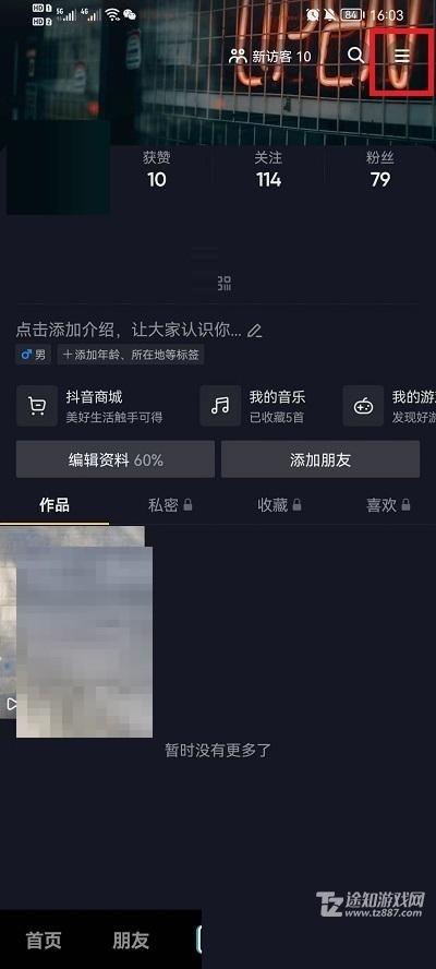 1、首先打开抖音(点击查看下载地址),进入到自己的个人主页,在主页中点击右上角的【三】打开扩展界面;