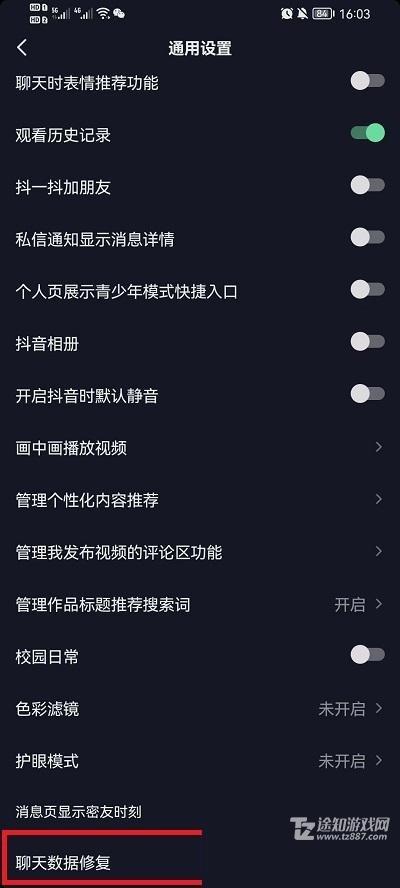 4、最后在通用设置所有功能中,滑道最下方,就可以看到【聊天数据修复】对自己的聊天记录进行修复。
