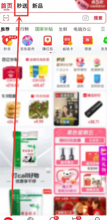 1、首先打开京东app,在首页顶部切换到秒送专区